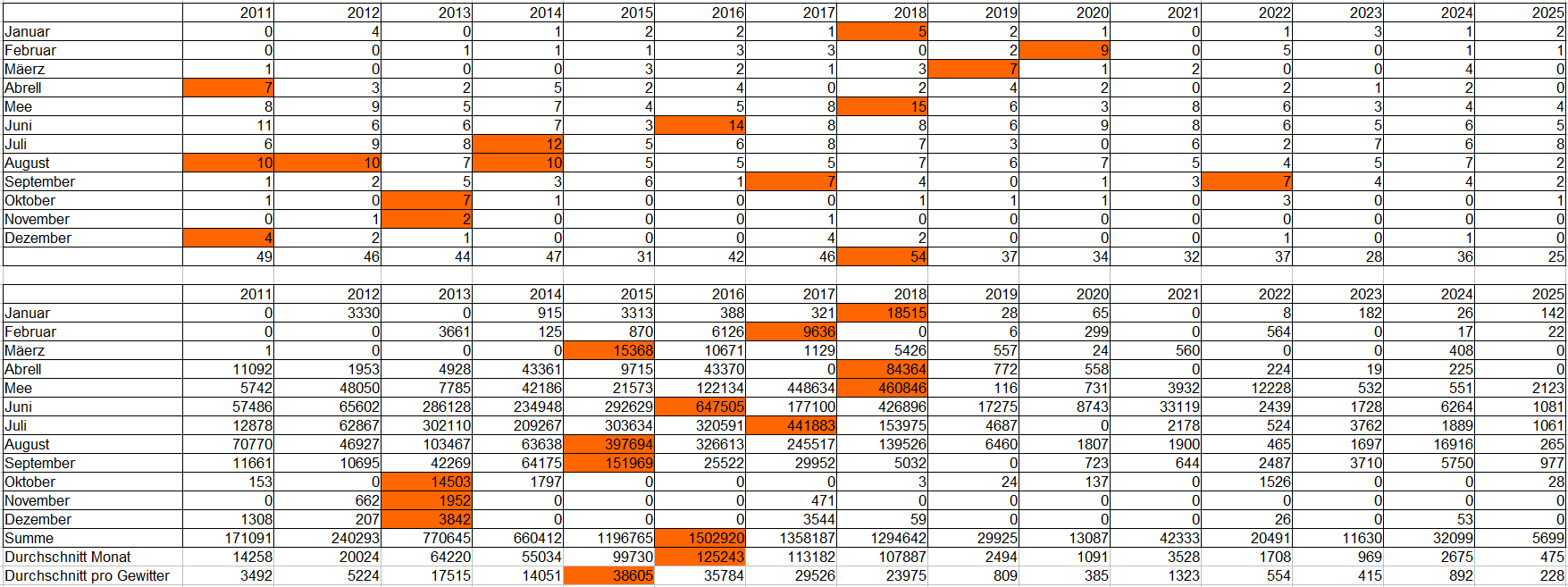 Alle Gewittertage und Blitzanzahl der vergangenen Monate und Jahre im Überblick